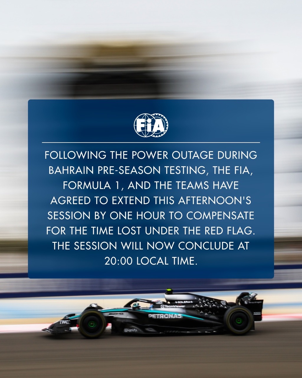 La solución de la FIA, en acuerdo con todos los equipos y la Fórmula 1, fue reponer esa hora extendiendo la duración de la segunda sesión vespertina de los test de este 26 de febrero (por cierto, no te pierdas los test en Bahréin, AQUÍ te decimos a qué hora y dónde verlos).
