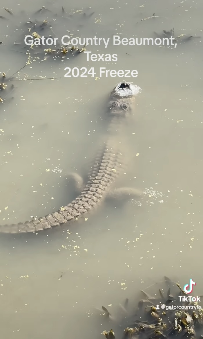 Ooootro caso sucedió en el parque Gator Country en Beaumont, Texas, donde captaron a uno de los caimanes con la punta de su hocico afuera del hielo para poder respirar.