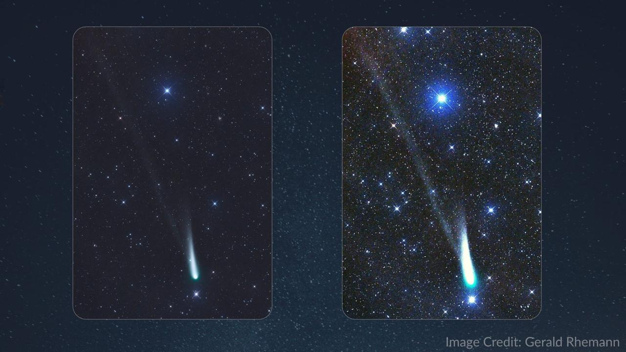 Es probable que en la aplicación de mapa estelar encuentres más sencillo la estrella o la constelación. Esta foto de Gerald Rhemann, que comparte StarWalk, muestra cómo se ve el cometa con un telescopio pequeño y sencillo (a la izquierda) y cómo se ve con una cámara DSLR más sofisticada (derecha).