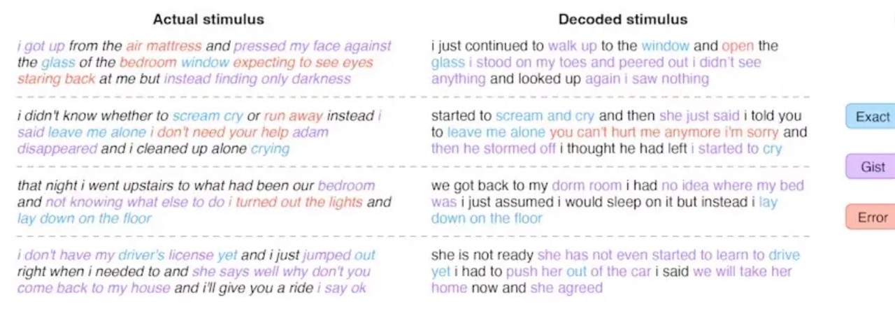 En la imagen de abajo, pueden ver del lado izquierdo la transcripción de los textos pensados por las personas de las pruebas. De lado derecho, están las transcripciones generadas por el decodificador a partir de las resonancias. No son textos iguales, pero lo expresado por la inteligencia artificial ‘lee mentes’ es bastante similar.
