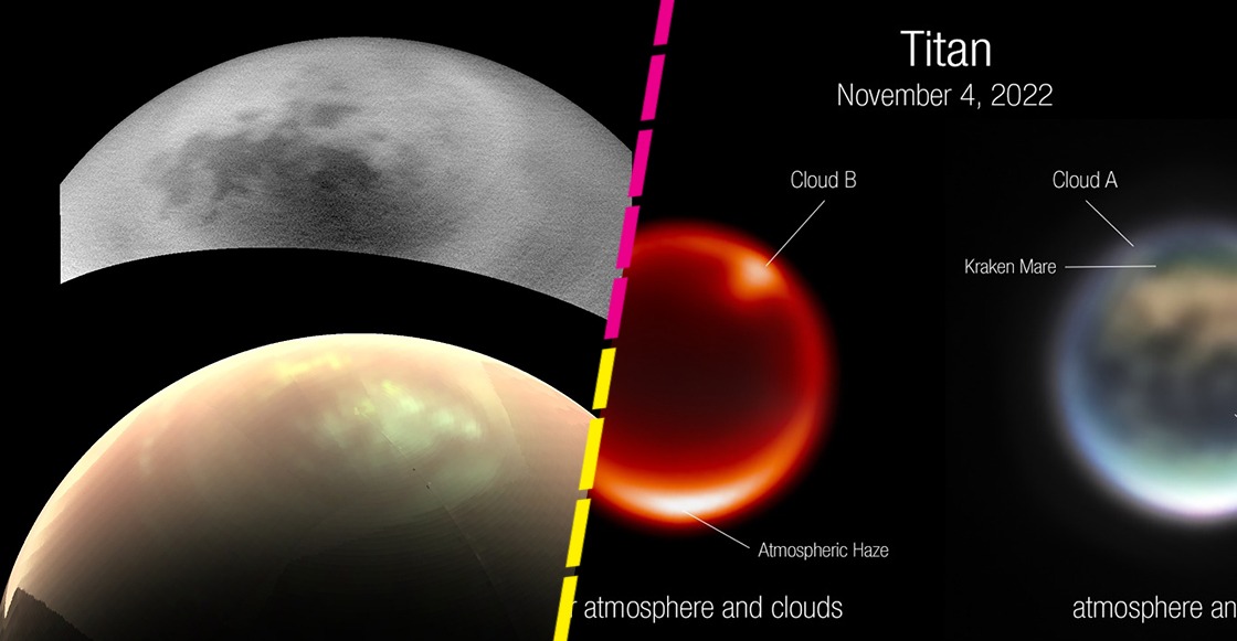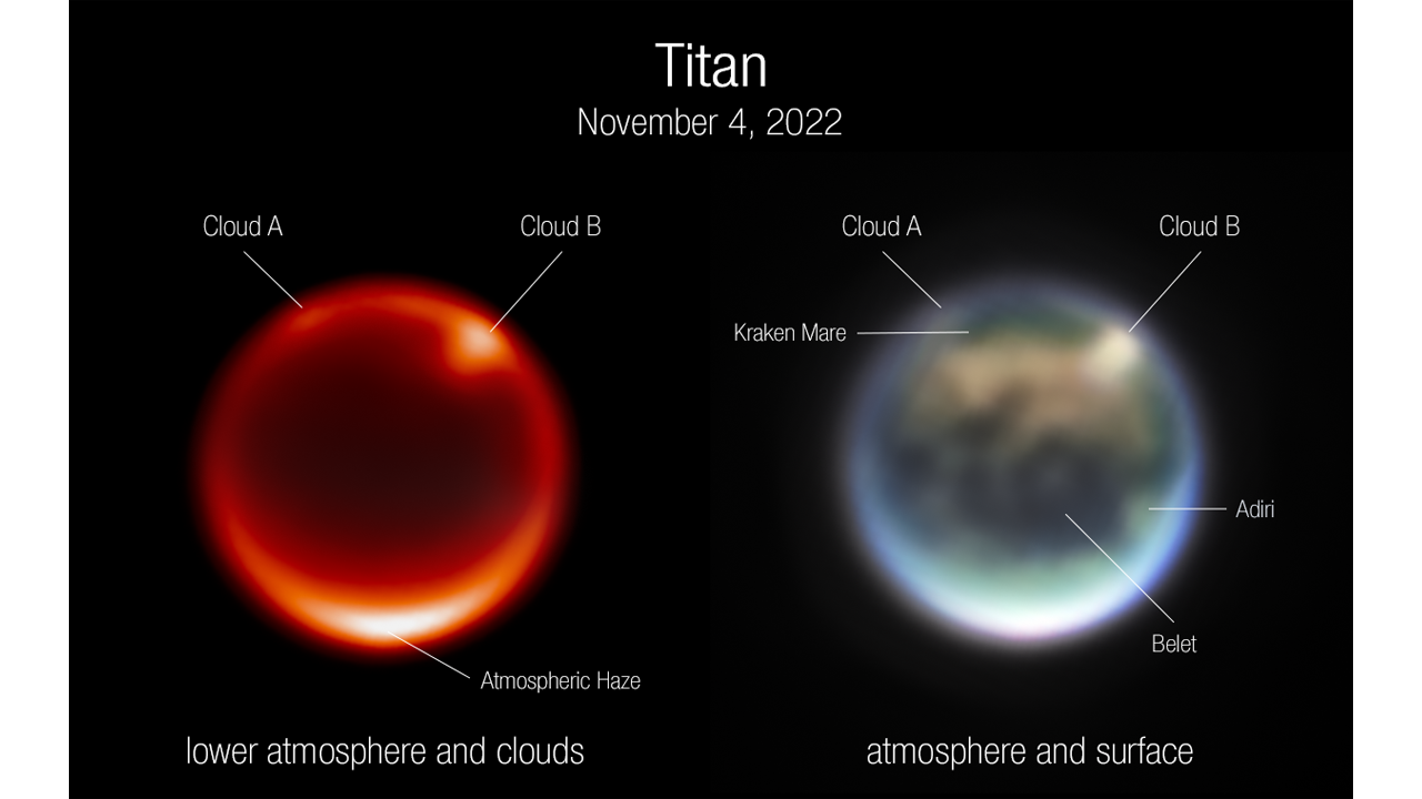 Las imágenes obtenidas son oro molido para estudiar la atmósfera de Titán, que es la única luna del Sistema Solar con una atmósfera densa. En ambas imágenes pueden observarse dos principales nubes, llamadas A y B en la foto.