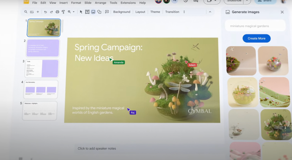 Otra de las nuevas funciones con IA involucra la creación de presentaciones. La idea es que pueden tomar cualquier documento en Google Docs o Gmail para crear un archivo perfectamente colorido en Slides.