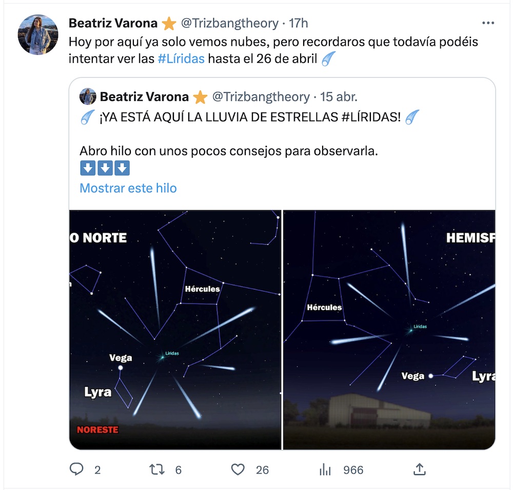 Beatriz Varona, astrónoma del Instituto de Astrofísica de Canarias, armó un buen hilo en Twitter —ACÁ lo pueden consultar— y ahí explicó que si bien las Líridas se pueden ver en todo el cielo, lo mejor es localizar el radiante de la lluvia que está precisamente en la constelación de Lyra (Lira).