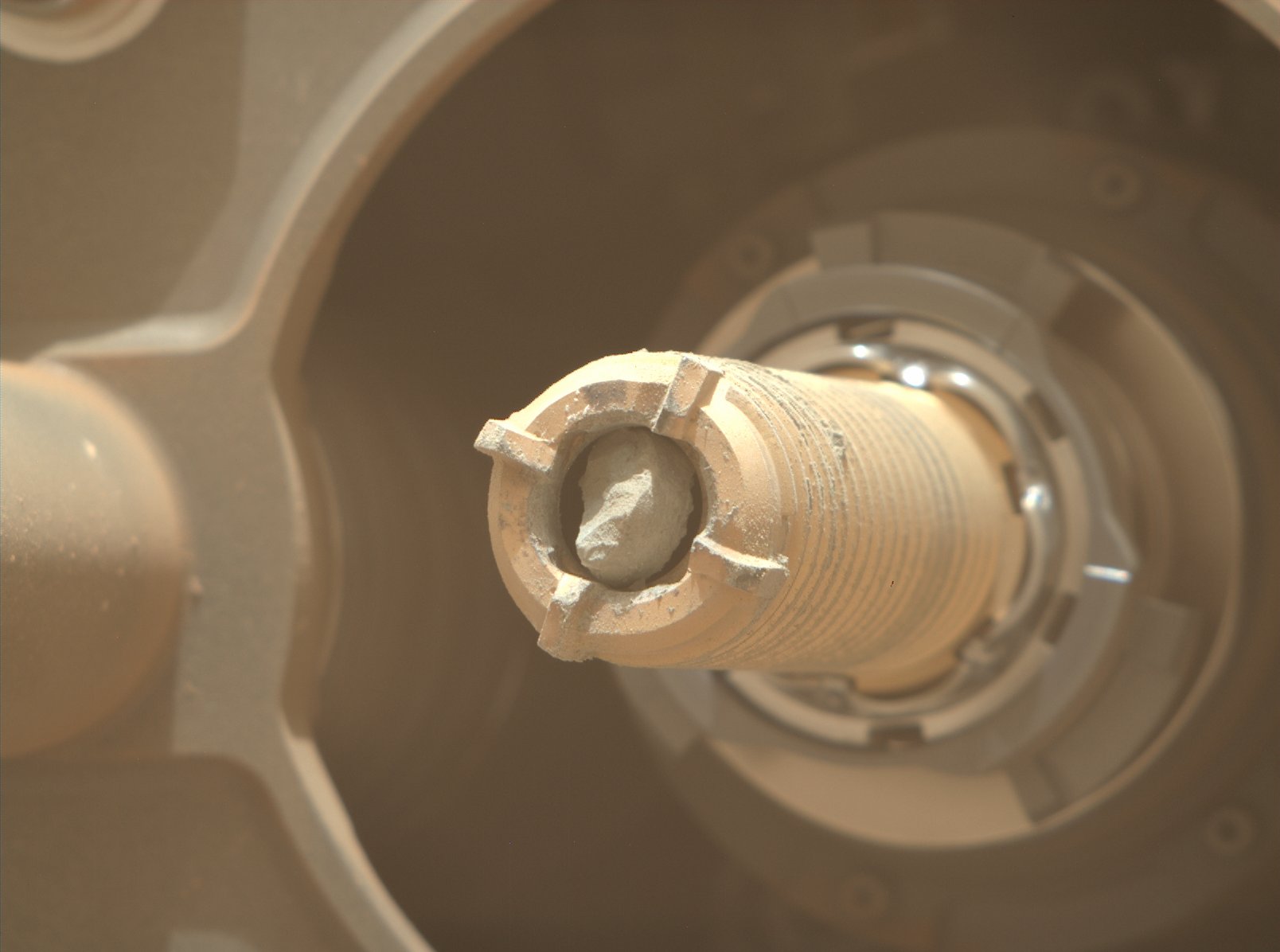 Una vez que el tubo cae, el Perseverance tiene que usar su brazo robótico y una cámara para revisar si el tubo cayó bien y no se rompió. Si resulta que el tubo cayó de manera vertical, sobre uno de sus lados planos, el rover puede usar su brazo para golpearlo y se caiga de manera horizontal.