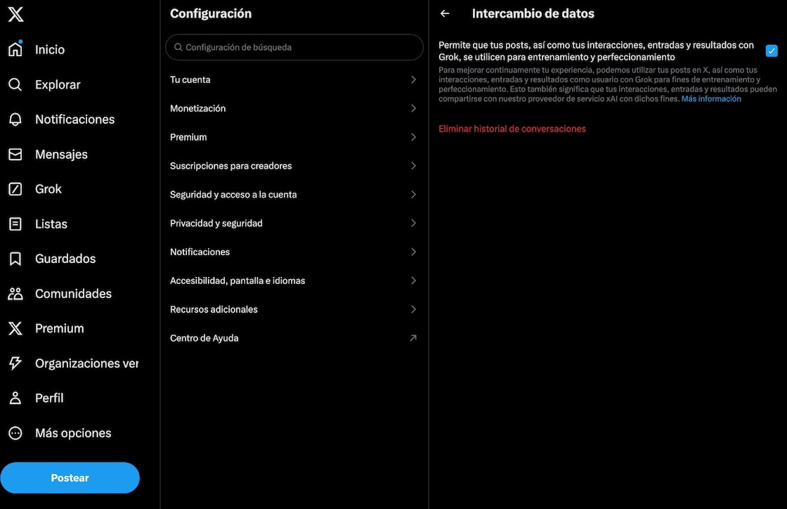 “Para mejorar continuamente tu experiencia, podemos utilizar tus posts en X, así como tus interacciones, entradas y resultados como usuario con Grok para fines de entrenamiento y perfeccionamiento. Esto también significa que tus interacciones, entradas y resultados pueden compartirse con nuestro proveedor de servicio xAI con dichos fines”, se lee en una parte de la configuración de la red social.