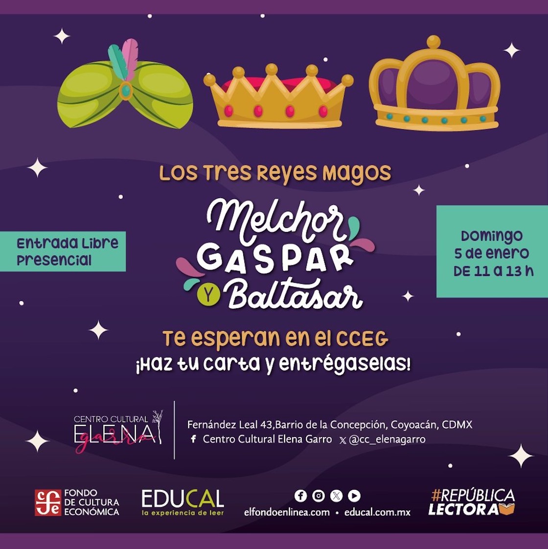 También los Reyes Magos estarán visitando el Centro Cultural Elena Garro, ya que en sus redes sociales anunciaron que el domingo 5 de enero, de las 11:00 a las 13:00 horas estarán recibiendo sus cartas, las cuales también puedes hacer en este lugar.