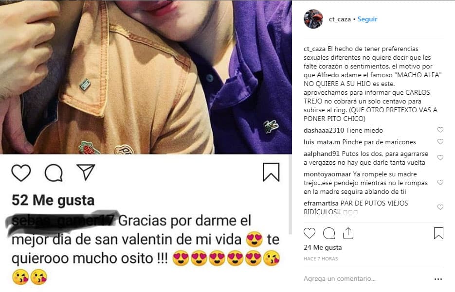 Después, en abril de este año, Carlos Trejo publicó una imagen del hijo de Alfredo Adame, en donde se veía al joven posando junto a su pareja. Ahí, Trejo escribió un mensaje en el que dijo que la preferencia sexual del chico era el motivo por el que Alfredo Adame no lo quería y la razón por la que se había distanciado de él. “El hecho de tener preferencias sexuales diferentes no quiere decir que les falte corazón o sentimientos. El motivo por el que Alfredo Adame, el famoso ‘macho alfa’ no quiere a su hijo es este”, dijo.