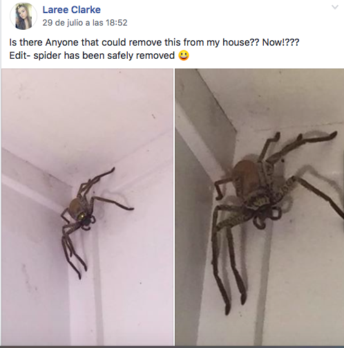 Si muchos de nosotros ponemos el grito en el cielo al encontrar una indefensa arañita de poco más de un centímetro merodeando por nuestra casa, imagínense a reacción de la joven australiana, Laree Clarke, al toparse con una araña gigante de alrededor de 30 centímetros que caminaba en los techos de su hogar, mientras cada uno de los ocho ojos del gigantesco arácnido la miraban fijamente. Una escena más espeluznante que Anabel y El Conjuro juntas. ¡Qué terror!