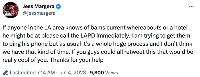“Si alguien en el área de Los Ángeles conoce el paradero actual de Bam o un hotel en el que podría estar, llame a LAPD de inmediato”, escribió la mujer que horas después confirmó a la fuente que la policía encontró a su hermano.
