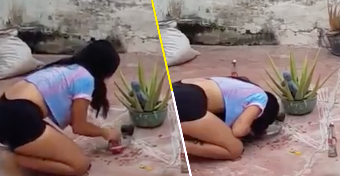 Resulta que en las benditas redes sociales comenzó a viralizarse el video donde se puede apreciar a la mujer llevando a cabo el ‘agua de calzón’ tranquilamente en el patio de su casa. En las imágenes podemos verla arrodillada en el piso –con todo y macetas, velas y hasta un pentagrama invertido que no sabemos como para qué funcionará–, remojando su ropa interior de color rojo en algunos recipientes de vidrio.
