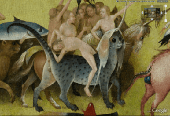 Para este artista, el gato es parte del paraíso y es uno de los encargados de conservar el orden a través de la caza de artimañas. También aparecen algunos momentos del Jardín de la lujuria, en este cuadro podemos ver a un gato-unicornio y a otros mininos de formas desproporcionadas que acompañan la metáfora del humano.