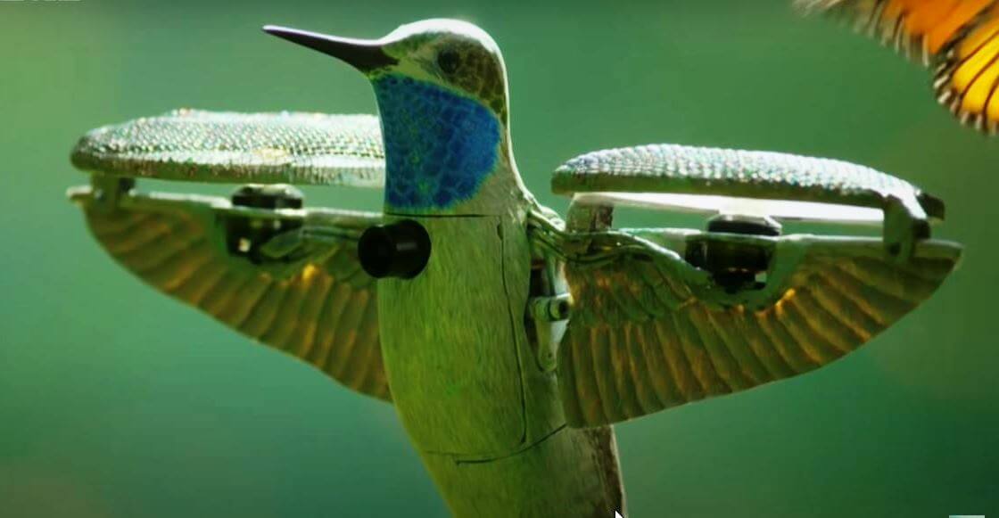 Para que no sea invasivo este pájaro mecánico, es totalmente silencioso, sus alas encubren las hélices,.