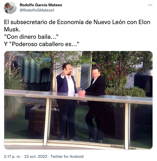 Sí, leyeron bien. Este fin de semana (23-24 de octubre) el conocido fundador de Tesla y SpaceX, así como el aparente próximo dueño de Twitter (acá les contamos cómo va ese asunto), fue captado en la tierra de la carnita asada, donde se reunió con Samuel García y Mariana Rodríguez.