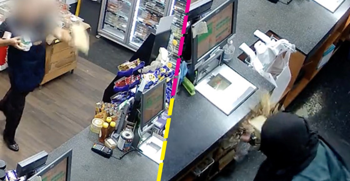 En las cámaras de seguridad de la tienda se puede ver que el hombre intenta abrir la caja registradora para llevarse el dinero. Sin embargo, en unos cuantos segundos aparece una de las trabajadoras para lanzar un paquete de natillas que casi le da al sujeto en la cara.