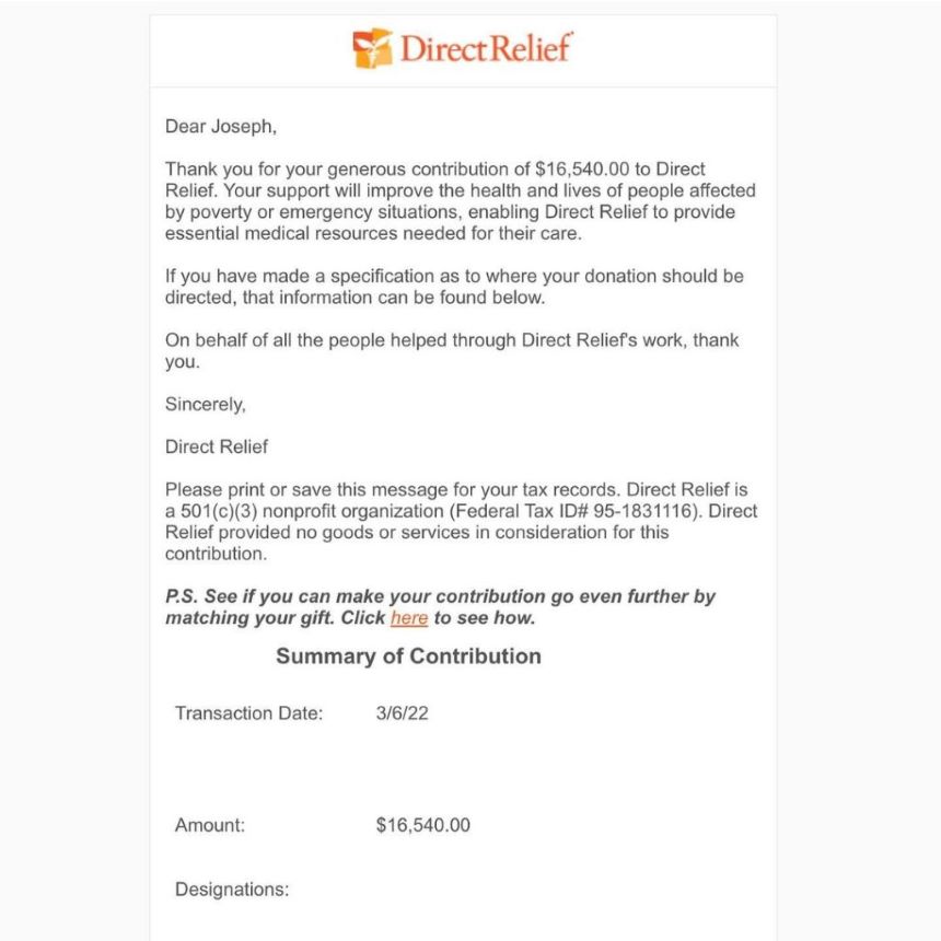 Aunque los elementos del cóctel molotov finalmente eliminaron su publicación inicial de Instagram, el minorista aún logró recaudar la enorme cantidad de $16,540 dólares. Todo el dinero íntegro, fue donado a la organización sin fines de lucro ‘Direct Relief’. Lo más emotivo, fue que la organización agradeció el donativo a través de una carta en la que se comprometen a utilizar los fondos para mejorar las condiciones de vida de las víctimas en situación de emergencia.