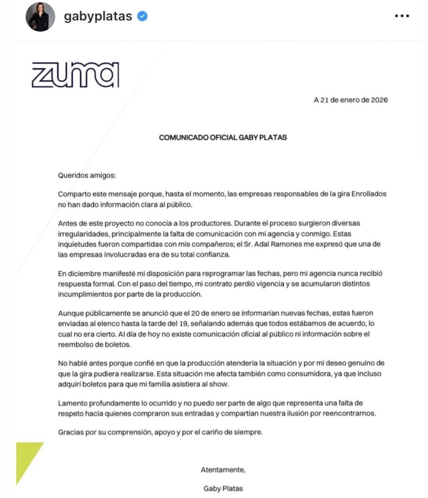 En el comunicado de ambas empresas solo se dijo que decidieron cancelar ‘tras una evaluación integral del proyecto’. Algo que no explica mucho o mejor dijo, nada, a los fans. Sin embargo, Gaby Platas emitió un comunicado en el que expone ‘irregularidades’ por parte de la producción; contratos vencidos, falta de seguimiento a las fechas e información enviada de última hora.