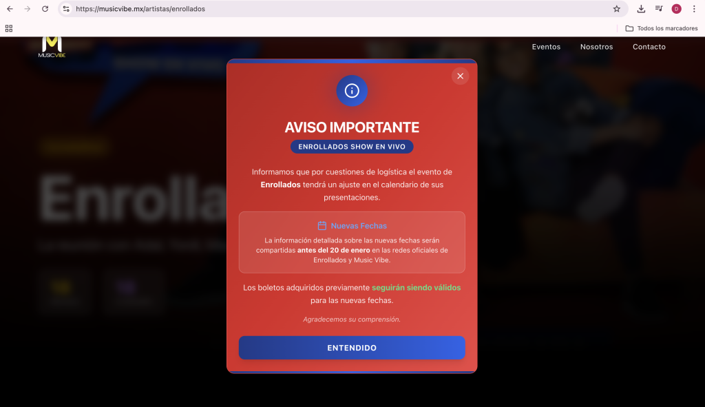 Por medio de la presente, MUSICVIBE, productora de la gira ENROLLADOS, informa que, tras una evaluación integral del proyecto, la gira queda oficialmente cancelada. Lamentamos profundamente los inconvenientes que esta decisión pudiera ocasionar y agradecemos sinceramente al público por el interés”.