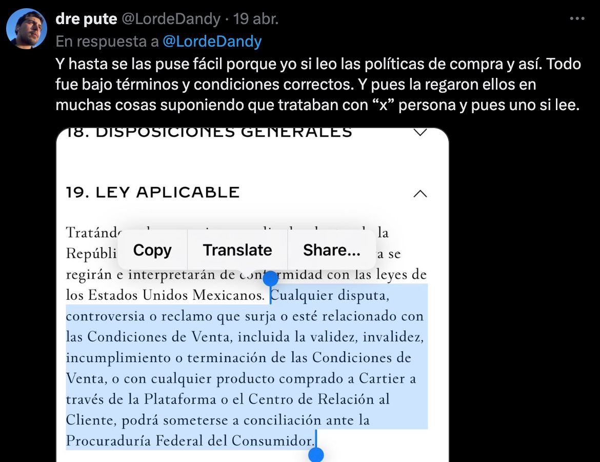 El buen @LordeDandy no dejó con la duda a los curiosos que querían saber qué pasó con la compra: ¿Se la hicieron válida?, ¿le regresaron el varo?, ¿le mandaron la pura caja? Pues bien, de acuerdo con El País, inicialmente Cartier se negó a entregar el ani… los aretes, argumentando que todo se trató de un error humano. Sin embargo, Rogelio echó mano de las políticas de compra de la joyería… entonces, al parecer estaba por la Procuraduría Federal del Consumidor (PROFECO).
