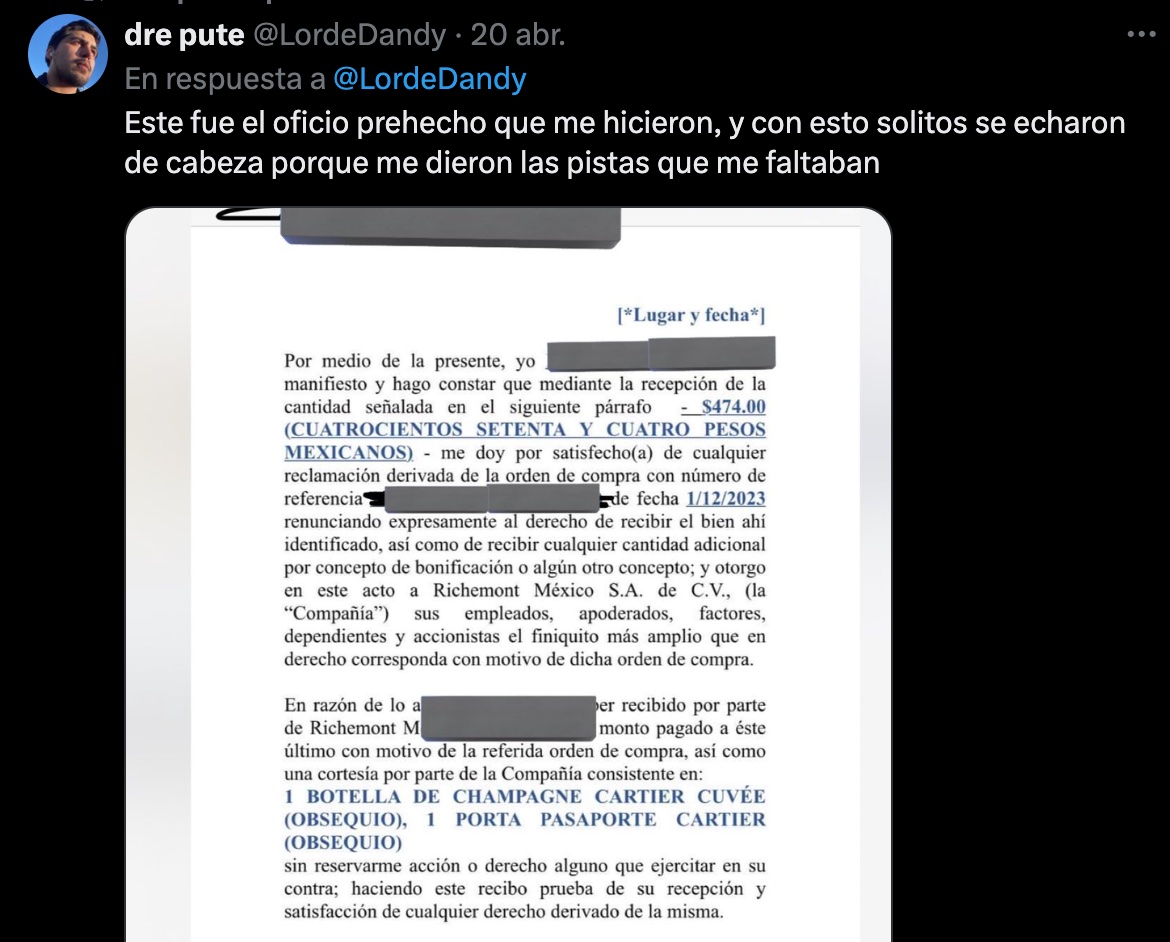 Sin embargo, parece que esto último ya no fue necesario. En redes, @LordeDandy (o dre pute, como se hace llamar) fue mostrando el progreso de su pedido. Y, ahí, todos sus seguidores pendientes de si llegaba o no lo comprado en Cartier. Al final, parece que la fina joyería cedió.