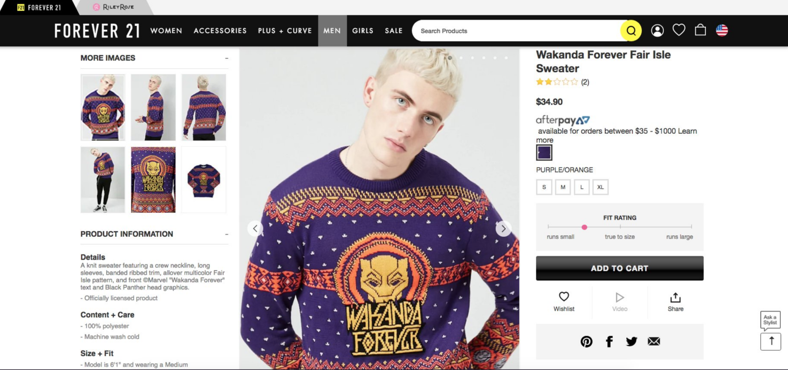¿Qué hay de malo en eso? Finalmente, otras tiendas de ropa han retomado otras películas o series como Stranger Things y Bohemian Rhapsody para sus prendas. La cuestión con Forever 21 fue que, para vender este suéter navideño de Black Panther –película representativa del black power– utilizó a un modelo caucásico… demasiado caucásico para algunos.