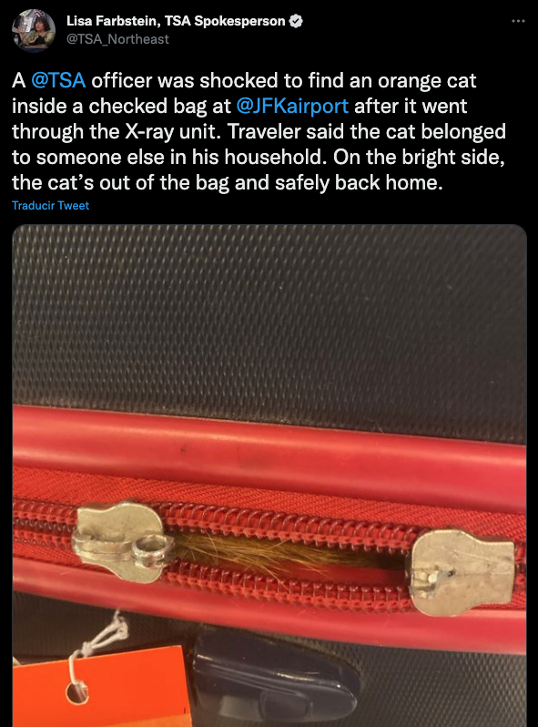 “El gato está fuera de la bolsa y de vuelta a casa a salvo”, dijo el Administración de Seguridad en el Transporte (TSA) en un comunicado vía Twitter.