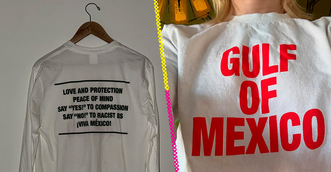 La playera “Golfo de México” está impresa con los colores de la bandera mexicana: verde, blanco y rojo. Al mismo tiempo, trae una leyenda en la parte de atrás donde se lee “Amor y protección. Tranquilidad. Di sí a la compasión y no al racismo. ¡Viva México!”.