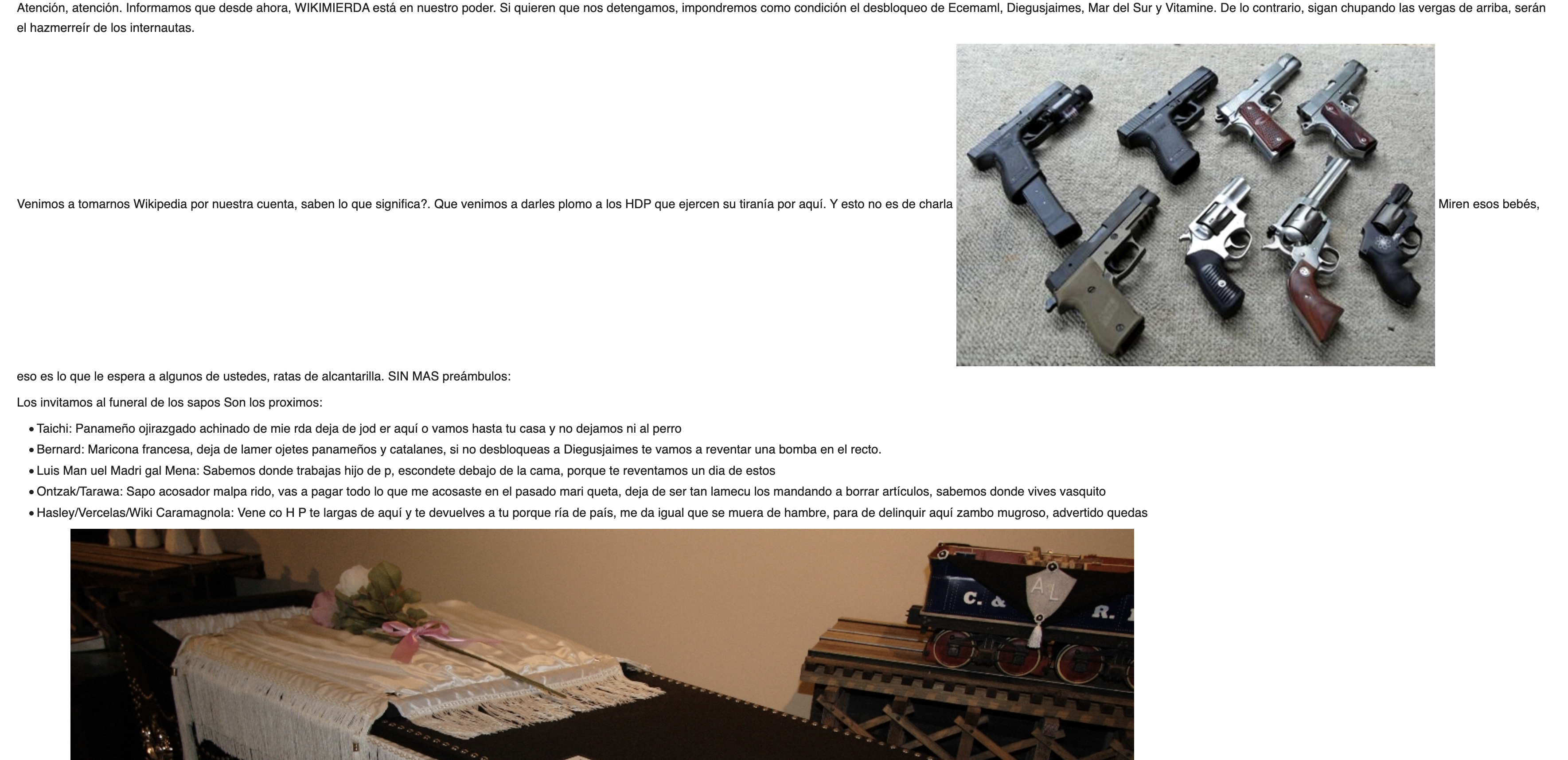 A través del texto en cuestión, los hackers amenazan a un grupo de personas que al parecer se dedican a editar textos en el sitio web, existente desde el año 2001 y el cual ha servido a millones de personas cuando de encontrar información basta y sintetizada se trata.