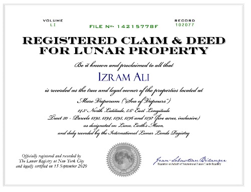 Si la carrera por conquistar el espacio va tan avanzada, era de esperarse que algunas personas ya piensen en establecer algún tipo de patrimonio a futuro “en el infinito y más allá”. Tal es el caso del abogado Izram Ali, quien confiando plenamente en su espíritu emprendedor, no dudó en comprar un terreno en la Luna por unos buenos dólares.