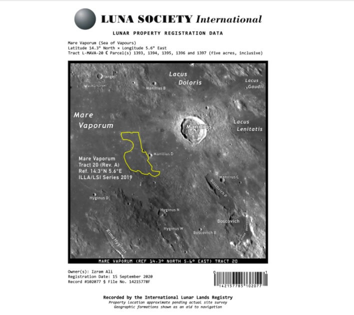 Alí señaló a un diario local que en el 2020, se topó con un anuncio en redes sociales donde se anunciaba la venta de espacios lunares. Sin dudarlo, envió una solicitud a la empresa ‘Lunar Company’ para comprar un par de terrenos en el satélite natural de la Tierra. Después de hacer el depósito por 130 dólares (poco más de 2,500 pesos al cambio actual, la firma le acaba de enviar un certificado de registro, donde se le declara propietario de las hectáreas numeradas del 1393 al 1397, ubicadas en ‘El Mar de los Vapores’, al suroeste de la cara visible de la Luna.