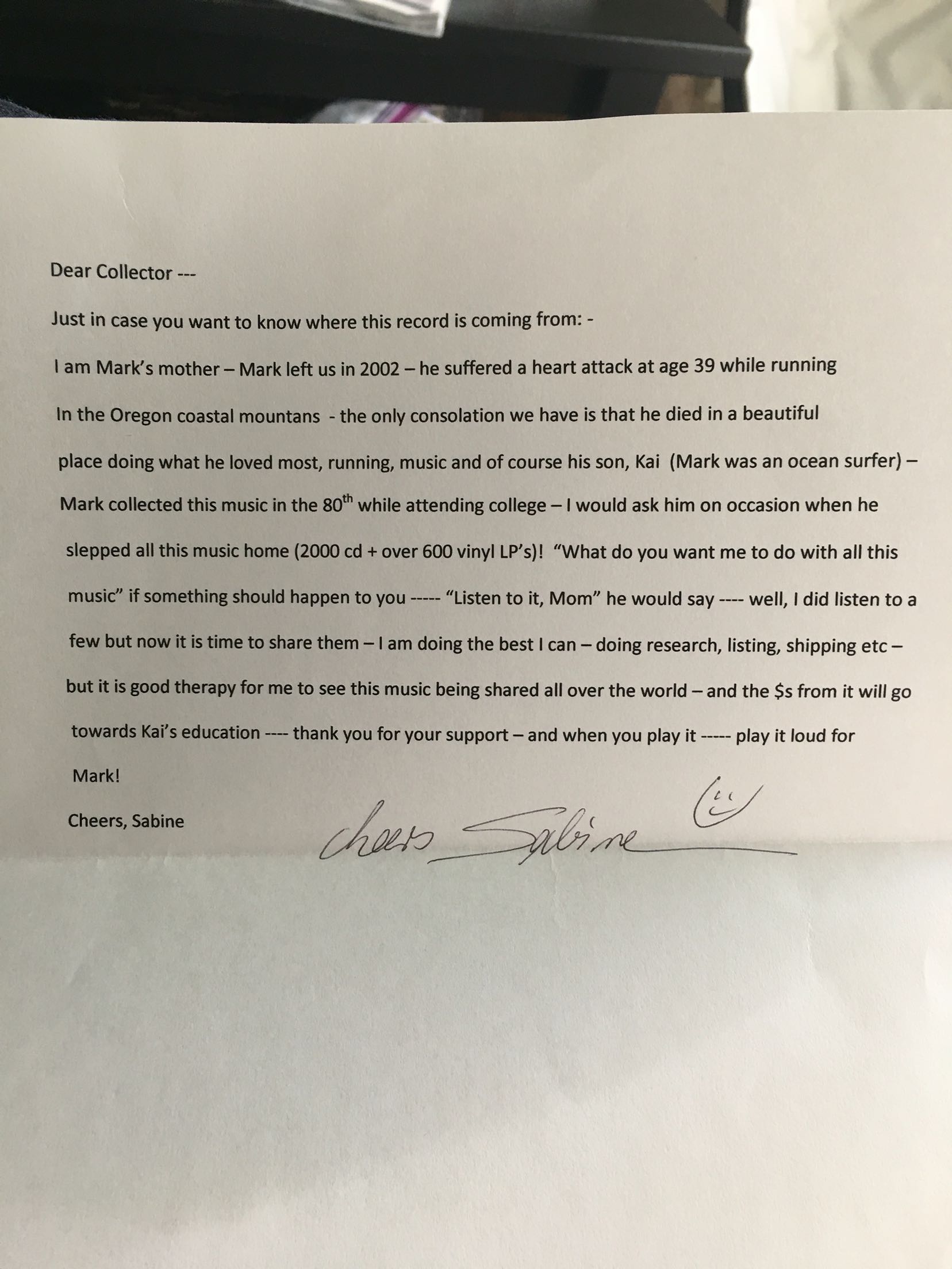 Soy la madre de Mark -Mark nos dejó en el 2002- sufrió un paro cardiaco a la edad de 39 años mientras corría en la montañas costeras de Oregon, el único consuelo que nos queda es saber que falleció en un lugar hermoso y haciendo lo que más amaba, correr, así como la música y a su hijo Kai (Mark era surfer). Mark coleccionó este y otros discos en los 80 cuando iba a la universidad; en una ocasión cuando guardaba toda su música en la casa (2000 CDs + 600 viniles!) le pregunté “¿Qué quieres que haga con toda tu música si algo te llegara a pasar?” — “Escúchala, Mamá” me respondió. Bueno, he escuchado un poco pero es tiempo de compartirla, estoy haciendo mi mayor esfuerzo , investigo, hago listas, los envíos, etc. Pero es buena terapia para mi ver que su música es compartida alrededor del mundo y que el dinero irá hacía educación de Kai. Gracias por tu apoyo y cuando la escuches, escúchala muy fuerte para Mark!Saludos, Sabine