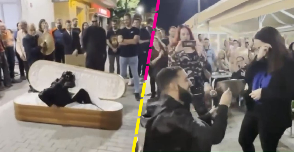 Ahora bien, hay varias cosas a resaltar en este video, así que vamos a desmenuzarlo un poco. En primer lugar cabe preguntarse, ¿cómo por qué un ataúd? Llegar así debe debe ser lo menos romántico en una “pedida de mano”, ¿no? Pero bueno, por ahí se teoriza que es por esa fama entre hombres de que se está poniendo la soga al cuello al casarse.