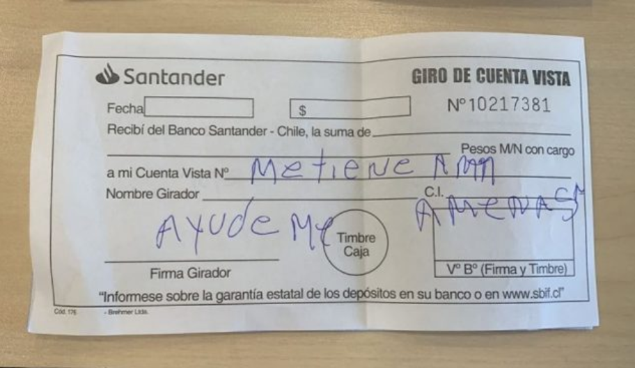 “Me tienen amenazado. Ayúdeme”, se lee en el cheque mostrado por las autoridades de Chile cuando hicieron ppúblico el caso (bueno, esa era la intención, porque en realidad el mensaje está mal escrito, muy probablemente por el miedo ante la situación en que estaba). La cajera comprendió de inmediato que estaba atendiendo a un hombre secuestrado y alertó a la policía local.