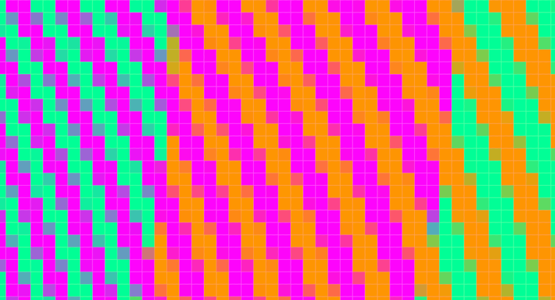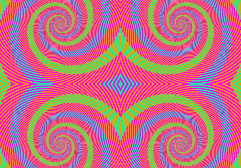 La cosa es que en la imagen solo hay 3 colores: verde, naranja y rosa. El azul claro que ven en algunas espirales es exactamente el mismo color verde de las espirales de al lado. De hecho, si hacen un zoom de la imagen, pueden ver los colores con mucha más claridad: