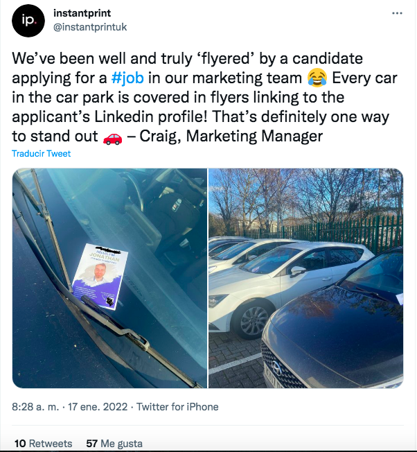 Tal como informa el periódico Yorkshire Post, Jonathan Swift consiguió el empleo en Instaprint. “¿Qué mejor manera de sobresalir que distribuir 500 volantes con mi cara alrededor del estacionamiento de la empresa?”, dijo el joven al medio antes citado. El gerente de marketing de la marca, Craig Wassell, mencionó que ya había visto desde su oficina a una persona colocando volantes en los coches del estacionamiento.