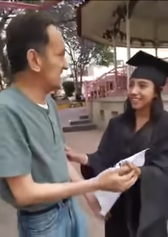 De repente, el cliente se dirige al señor, le pide que pare y que voltee porque alguien le está hablando. El hombre se sorprende al ver a su hija, quien le dice “lo logramos, papá” y revela que la persona a la que el estaban boleando los zapatos -y que además grababa el video- es su asesor de tesis.