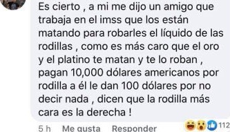 Después de eso, en redes sociales alguien comentó que un conocido del IMSS le había confirmado ese rumor. Pero no sólo eso, sino que además le detalló que la razón para “matar” a la gente en las clínicas mexicanas era porque les estaban robando el líquido de la rodilla para venderlo a las mafias internacionales, quienes pagan 100 dólares a los médicos por su silencio y por este tesoro que vale más que el oro. ¡Nos lo hubieran dicho antes!