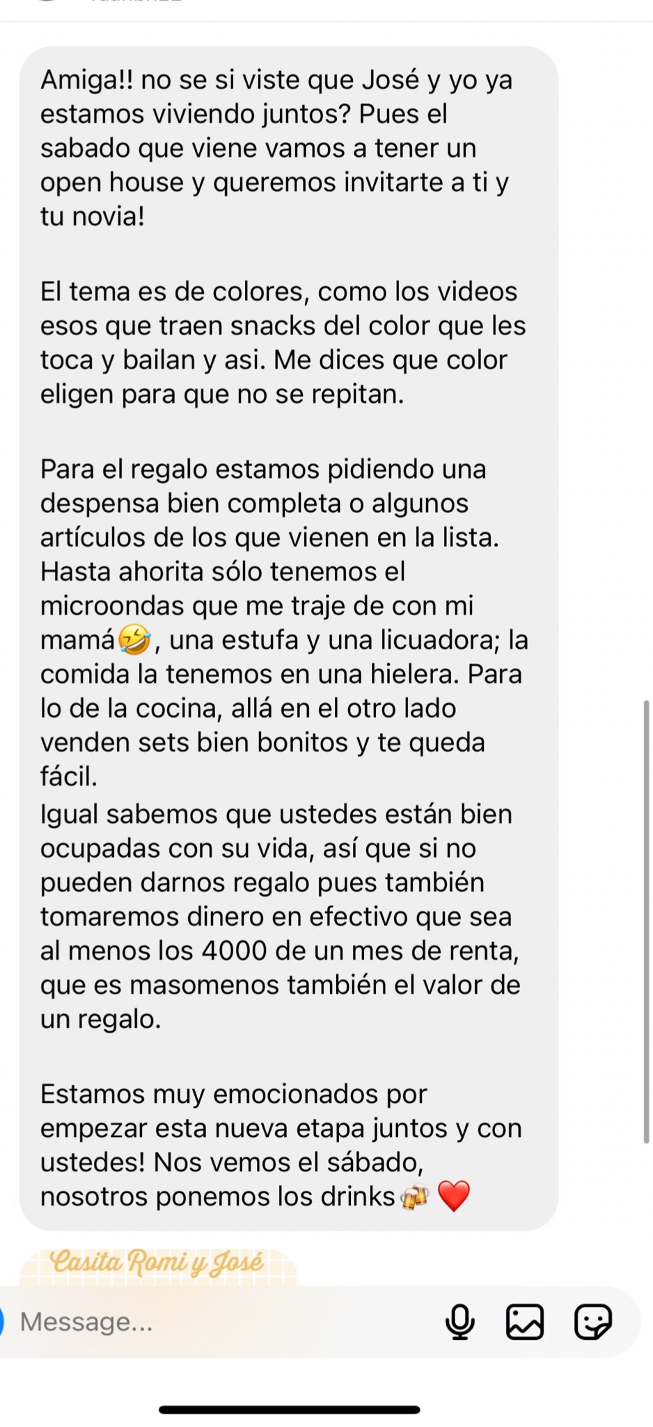 Si eso no fuera suficiente, Romina les da la posibilidad de dar el regalo en dinero en efectivo y que sean de a perdis’ los 4 mil pesos que pagan de renta, pues según ella ese el el valor promedio de un regalo para su ‘Open House’. ¡No puede ser!