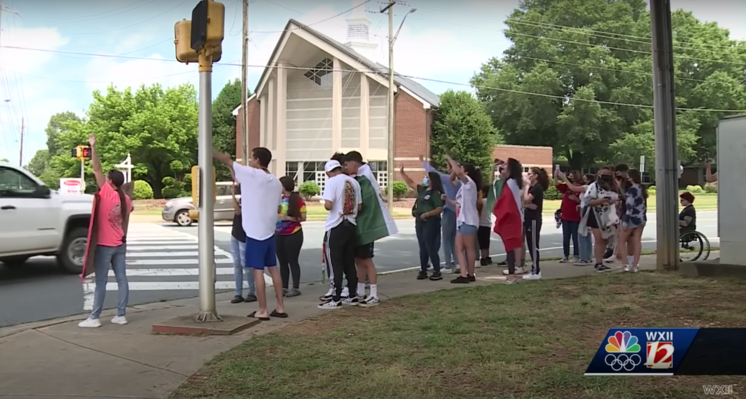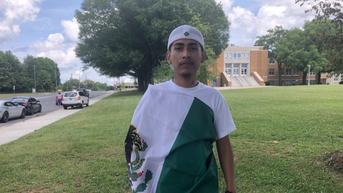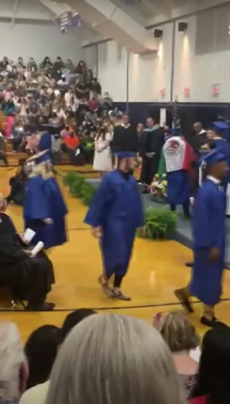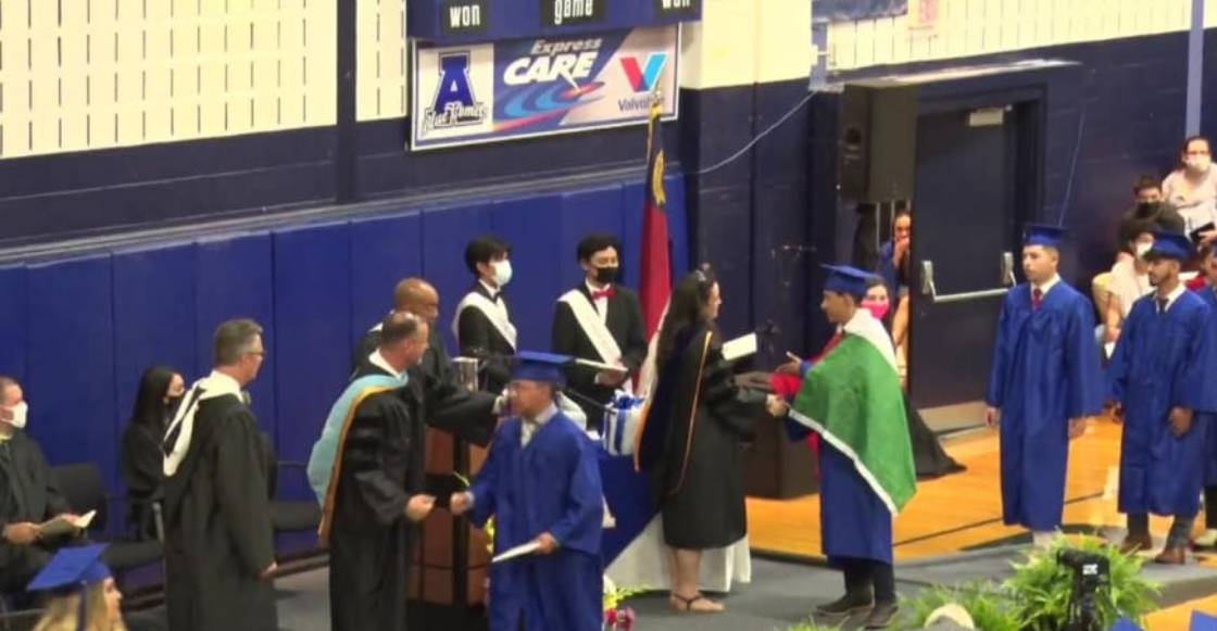 Esto ocurrió en una la Secundaria Asheboro, ubicada en Carolina del Norte. En un clip de poco más de un minuto se aprecia a una fila de estudiantes que usan toga y birrete color azul, mismos que están formados para recibir su diploma de graduación. De todos ellos destaca uno que tiene la bandera de México encima de tu vestimenta.