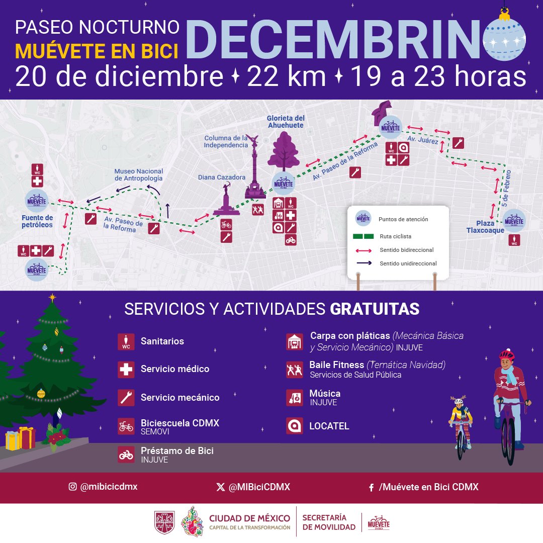 Esta vez, el Paseo Nocturno de Navidad recorrerá 22 kilómetros y será de Fuente de Petróleos hasta Plaza Tlaxcoaque, pasando por Paseo de la Reforma, Avenida Juárez, Venustiano Carranza y 5 de febrero.