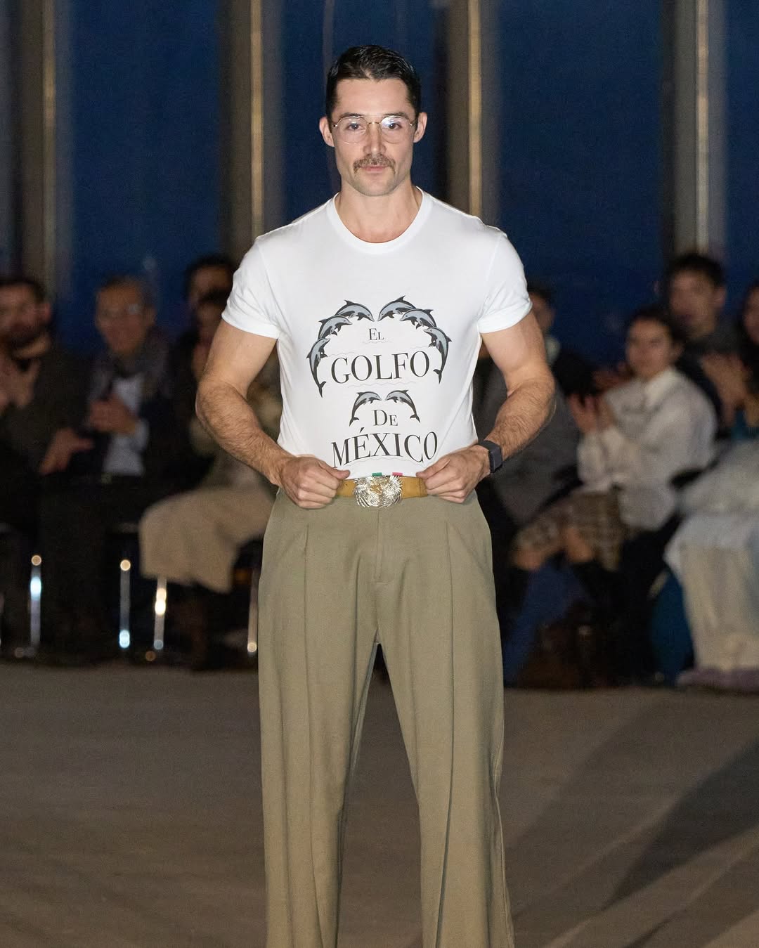 Al final del desfile, el diseñador nacido en la Ciudad de México, recorrió la pasarela con una playera que robó todos los reflectores en la que se leía ‘Golfo de México’ junto a unos delfines.