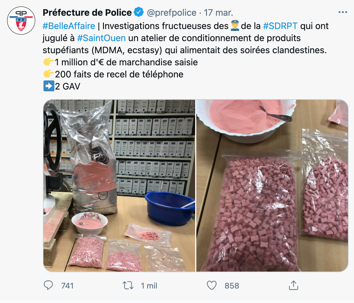 Así como leyeron. Resulta que el pasado miércoles 17 de marzo, la Prefectura de Policía de París compartió en su cuenta de Twitter que había descubierto un laboratorio clandestino de envasado de alucinógenos de MDMA en la región de Saint-Ouen. Según lo que mencionaban, ese lugar “abastecía a fiestas clandestinas” y señalaron que la mercancía que confiscaron tenía un valor de un millón de euros –algo así como 24 millones de pesitos–.