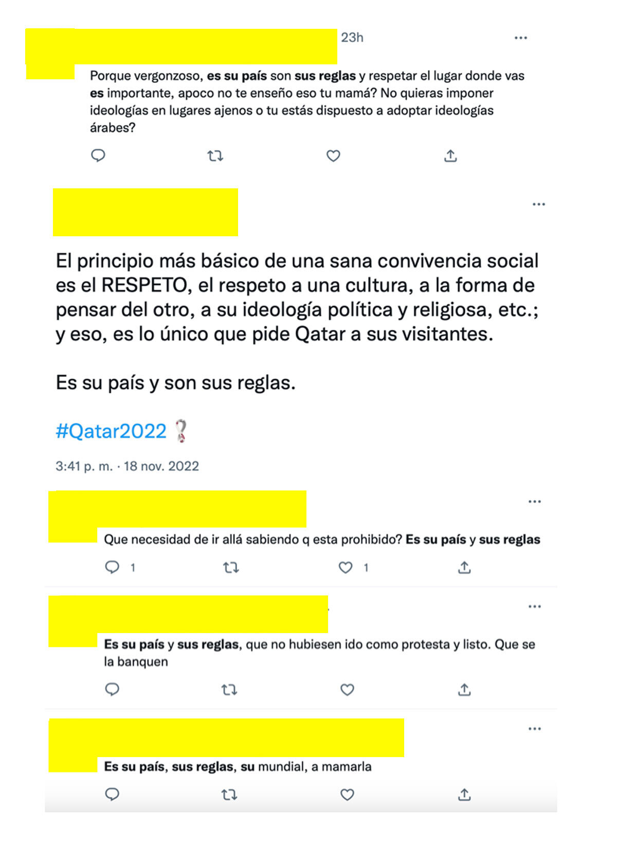 No hace falta agredir fisicamente a alguien para ser homofóbico o fomentar la discriminación, basta simplemente con echar un ojo a los miles de mensajes publicados en Twitter defendiendo la postura qatarí con la frase “su país, sus reglas”; lo cual nos habla del mucho trabajo que nos queda por hacer, no solo para visibilizar la problemática, sino también para concientizar y cambiar las falsas percepciones que podemos tener de “nuestra apertura”, “tolerancia” y un gran etcétera.