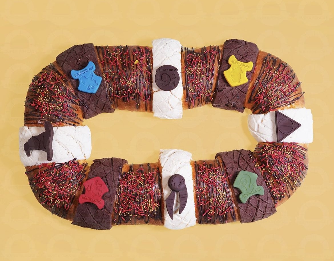 Tampoco podíamos dejar de lado la rosca mágica, que por supuesto, tiene muchos detalles que los fans de Harry Potter amarán. Para que se den una idea, cuenta con los escudos de las casas de Hogwarts: Gryffindor, Slytherin, Hufflepuff y Ravenclaw. Pero no solo eso, también está el símbolo de las reliquias de la muerte, el letrero del andén 9¾, la snitch dorada y el sombrero seleccionador. Y sí, a la hora de partirla en lugar del niñito Dios, se llevarán a Harry, Ron, Hermione o Voldermort para que saquen los tamales encantados.