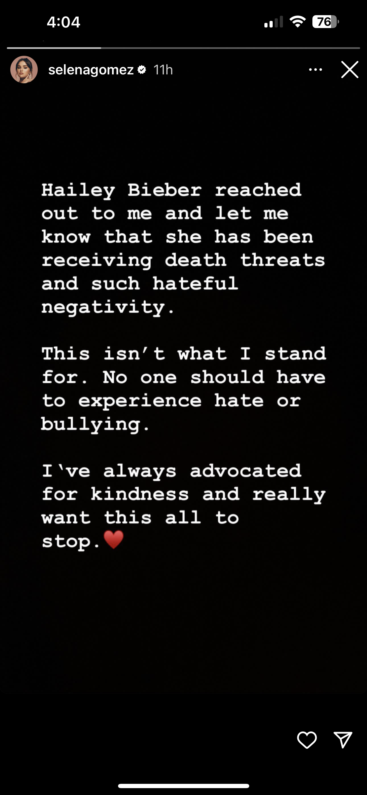 El viernes 24 de marzo, Selena Gomez publicó una historia en sus redes sociales donde pide que dejen de molestar a Hailey Bieber, pues la modelo se puso en contacto directo con ella para decirle que estaba recibiendo, incluso, amenazas de muerte.