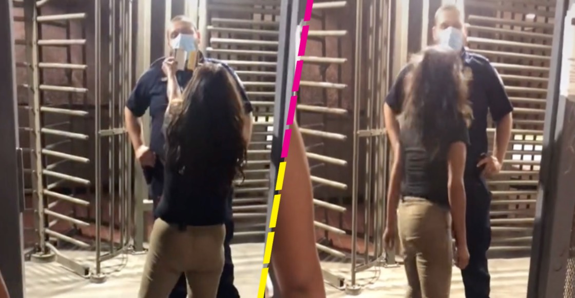 Luego del intercambio de palabras, la mujer -sin cubrebocas- sacó unos documentos y se los mostró al elemento de seguridad poniéndoselos en la cara. Tanto ella como el oficial siguieron dialogando de manera tensa hasta que la mujer se acercó al guardia y le escupió en la cara.
