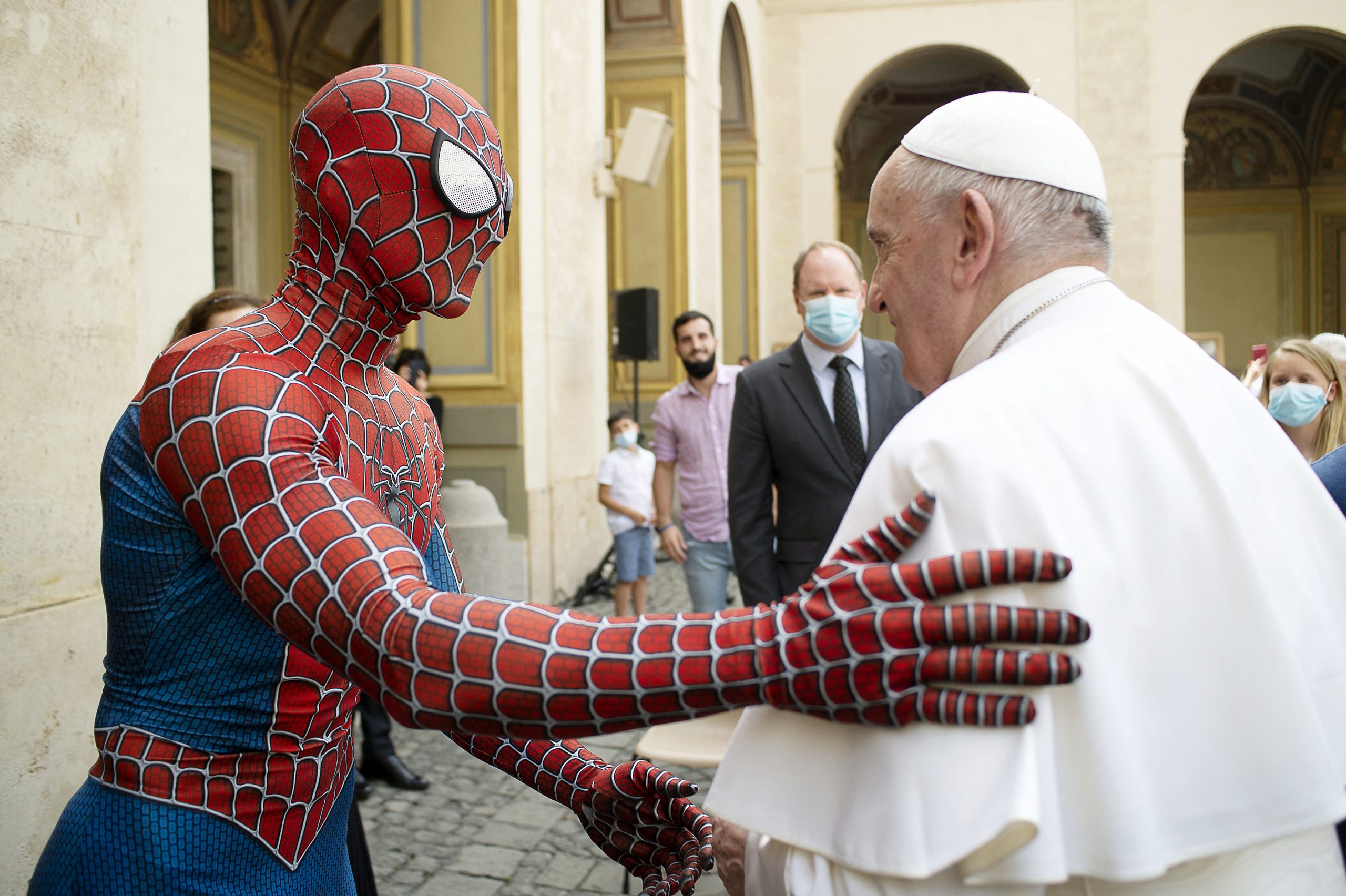 Por supuesto que esto no pasó desapercibido para el papa Francisco, quien de inmediato se acercó a Spider-Man y amablemente platicó con él. Después de unos minutos, ambos se despidieron no sin antes de que el Peter Parker de carne y hueso le regalara una máscara del personaje de Marvel creado por Stan Lee y Steve Ditko. Y aunque este momento dejó a todos con el ojo cuadrado, resulta que hay una razón por la que este hombre llegó al Vaticano.