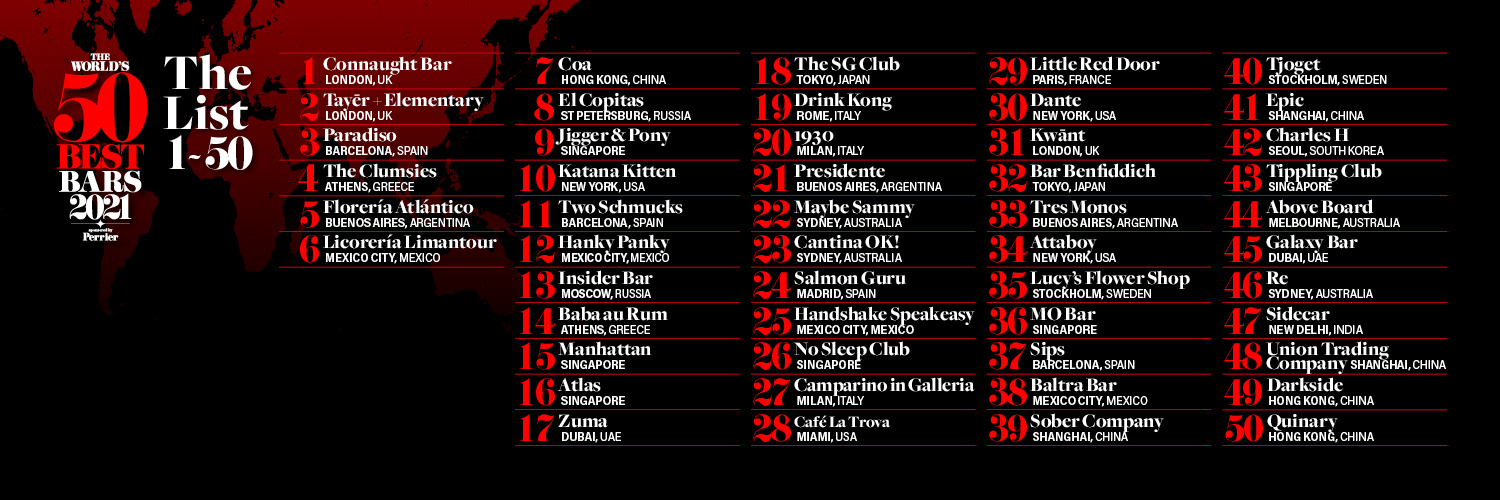 A continuación les mostramos la lista de The World’s 50 Best Bars 2021. Si quieren ver cómo quedaron los premios individuales y la lista completa con los 100 lugares, ACÁ en el sitio oficial de la organización encuentran en dato.