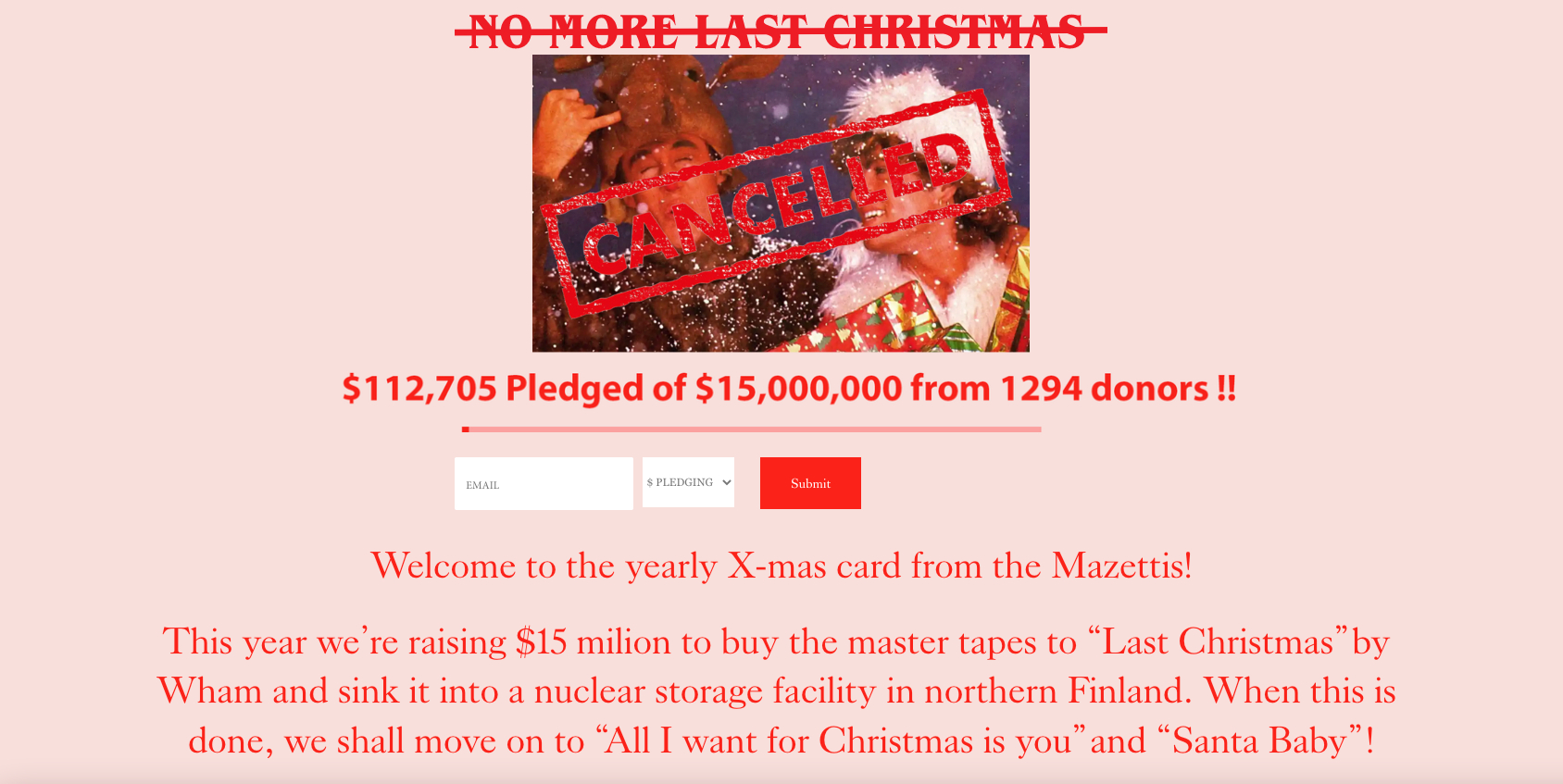 Como dijimos, su objetivo es bastante claro: quieren recaudar el dinero suficiente para comprar los derechos de la canción y sacarla de plataformas de streaming, así como limitar su reproducción en estaciones de radio tanto como se pueda. Y tanto detestan este tema clásico que han destinado un sitio web para explicar qué onda con todo esto.