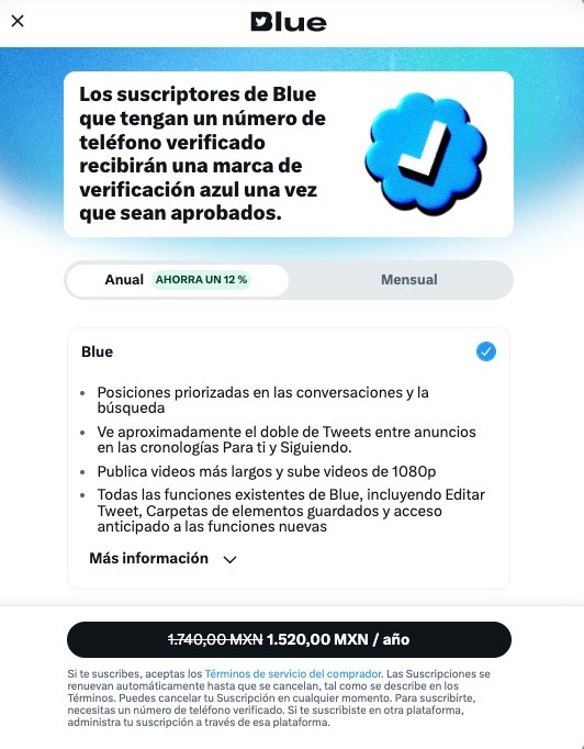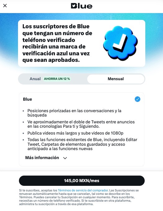 Dicho esto, ¿qué es lo que se puede hacer ahora? Seguro que algunos optarán por hacer caso omiso y preferirán quedarse sin la insignia azul. Pero para quienes decidan apegarse al régimen tuitero de Musk, les pasamos el dato: la suscripción a Twitter Blue cuesta en México $145.00 pesos mensuales.