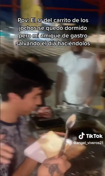 Hace algunos días y gracias a la magia de las redes sociales, nos enteramos de esta peculiar historia. Resulta que un usuario de TikTok llamado @angel_vies compartió en dicha plataforma un video en el que cuenta que él y sus cuates andaban por la calle cuando vieron al señor del carrito de jochos en su decimoquinto sueño. Pero eso no es lo peor de todo, lo gacho es que por echarse un coyotito, descuidó por completo su puesto y claro, no hubo quién le comprara.